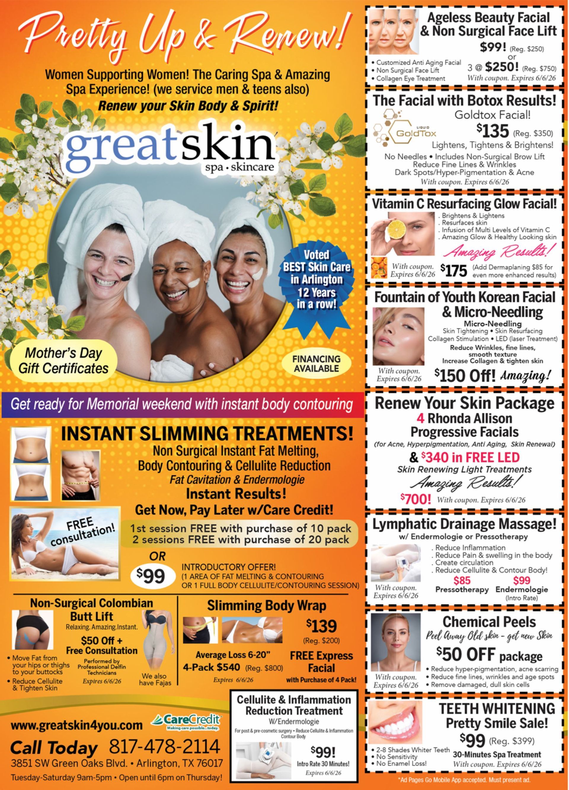 At Great Skin Spa & Skin Care, we make it easy to look and feel your best with exclusive spa specials and limited‑time skin care offers tailored to your needs. Conveniently located in Arlington, TX, and serving the surrounding areas, we feature special pricing on popular services like facials, massages, and contouring treatments. Contact us today to learn about our current specials and book your appointment while offers last.